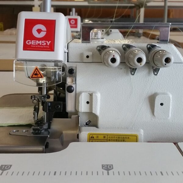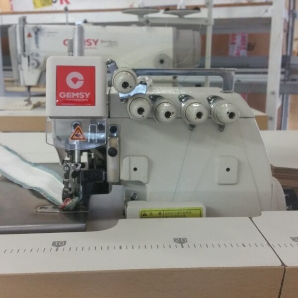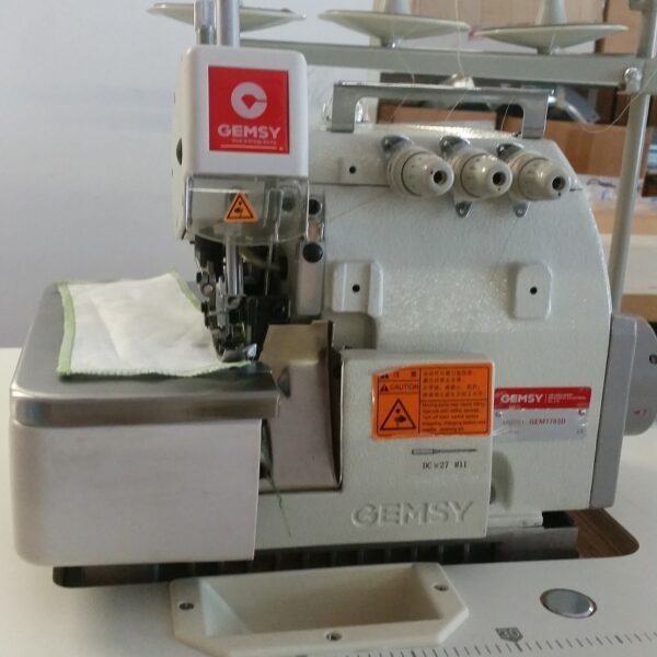 Macchina tagliacuci Gemsy, un ago, tre fili, direct drive, completa di tavolo, sostegno e motore. -