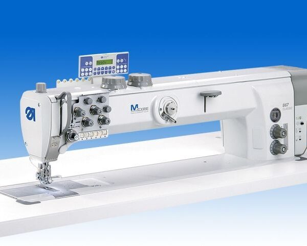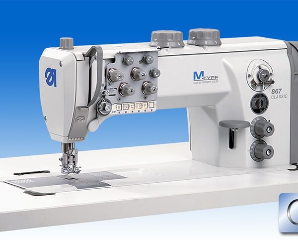 Macchina due aghi da3a60mm di interasse, punto annodato, trasporto a griffa punta d’ago e piedini alternati regolabili fino a 9mm, manopola per regolazione alternanza piedini, crochet verticali extra-large(+70%). Alzata piedini 20mm. Passaggio utile a destra dell’ago700mm alt125mm. Frizione di sicurezza. Motore diretto con pannello di controllo DAC-ECO. Velocità fino a 3.000 punti/min. -