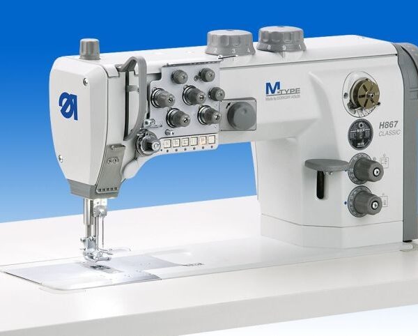 Macchina piana, due aghi da 3 a 50 mm. di interasse, punto annodato, trasporto a griffa punta d’ago e piedini alternati con alternanza regolabile fino a 9 mm. Rasafilo elettromagnetico, travettatura ed alzapiedino elettropneumatici, manopola per regolazione alternanza piedini.