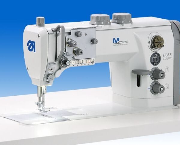 Macchina piana, un ago, punto annodato, trasporto a griffa punta d’ago e piedini alternati con alternanza regolabile fino a 9 mm. Rasafilo elettromagnetico, travettatura ed alzapiedino elettropneumatici, manopola per regolazione alternanza piedini. Crochet verticale maggiorato con dispositivo per tensione filo bobina costante. Alzata piedini 16 mm. -