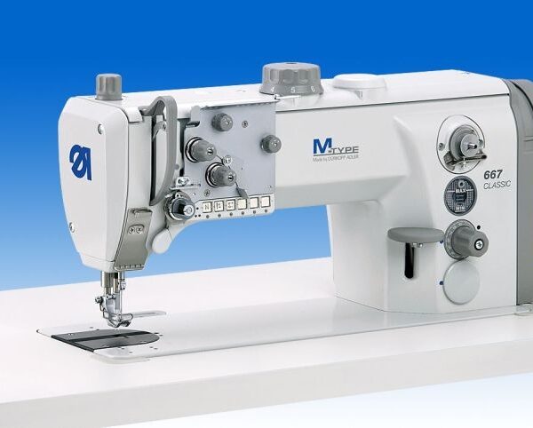 Macchina piana a testa lunga (700 mm. a destra dell’ago), un ago, punto annodato, trasporto a griffa punta d’ago e piedini alternati con alternanza regolabile fino a 9 mm. Rasafilo elettropneumatico, seconda tensione elettropneumatica, doppia lunghezza punto max 12 mm., travettatura ed alzapiedino elettropneumatici, regolazione alternanza piedini elettropneumatica con ginocchiera. -