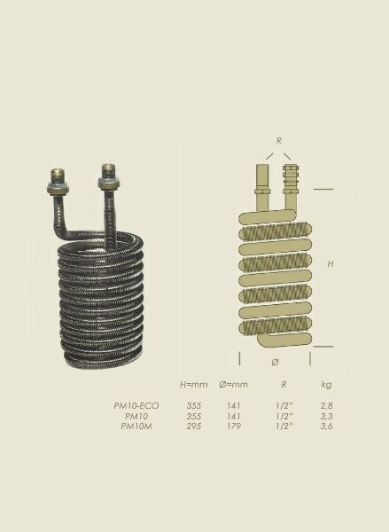 Serpentina nichelata Modello PM10M-Maxi Altezza 295 mm Diametro spirale 179 mm Dimensione attacchi 1/2" Peso 3.6 Kg391.21€ Aggiungi al carrello -