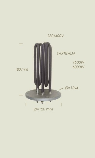 Resistenza con flangia tonda Modello Sartitalia Lunghezza 180 mm Potenza 4500 W 230/400 V Dimensione flangia 4 fori da 10 mm Diametro flangia 120 mm126.36€ Aggiungi al carrello -