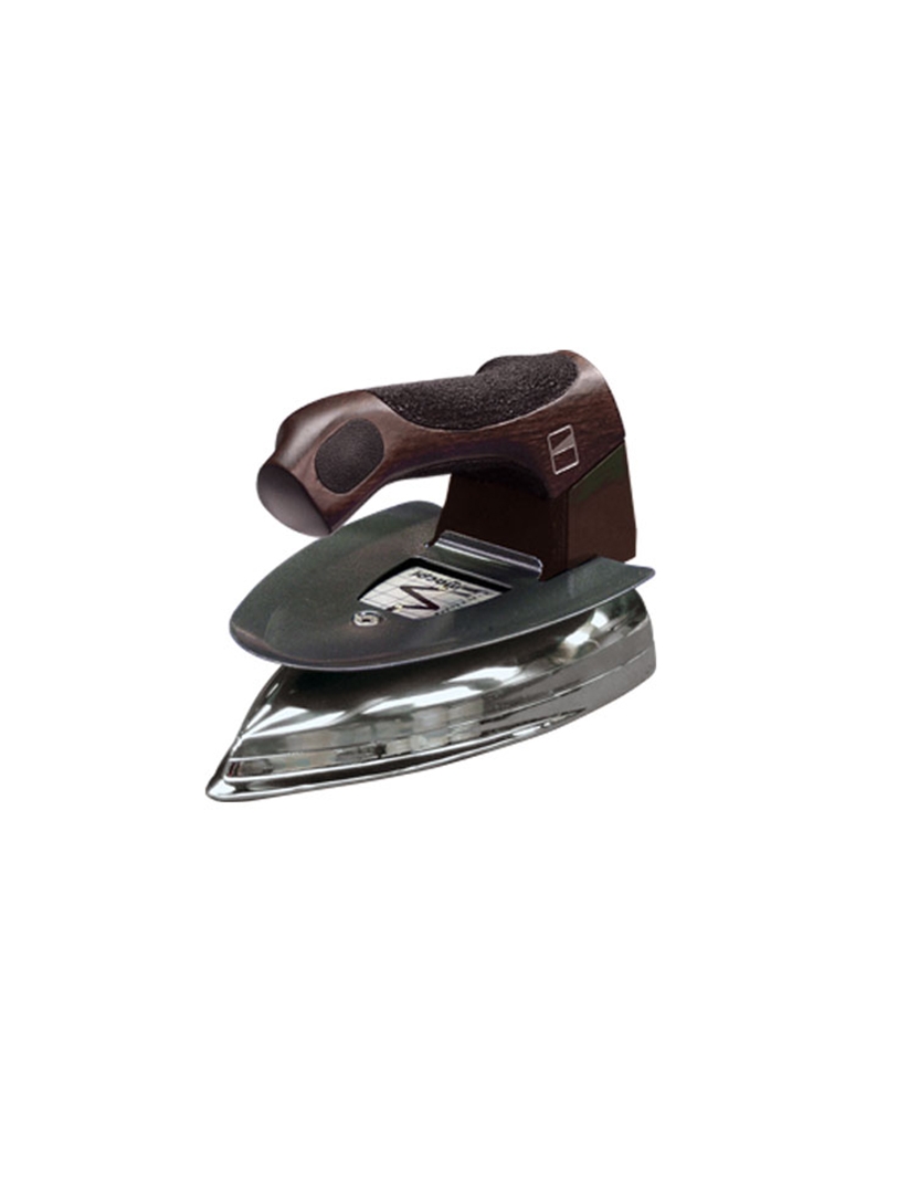 Elettroferro per ripasso fodere, non vaporizzante, con riscaldamento elettrico (controllo della temperatura elettronico con comando a distanza. Questo dispositivo permette un controllo molto preciso della temperatura +/- 2°), completo di schermo paracalore. L”impugnatura è realizzata in legno con sagomatura anatomica. La piastra è in alluminio anodizzato per il tipo da Kg. 1,45, in ottone cromato per i tipi da Kg. 2,65 e 3,50 ed in acciaio inox per i tipi da Kg. 1,25. Questo elettroferro richiede un allaccio elettrico (1+N~50/60Hz 230 V)
