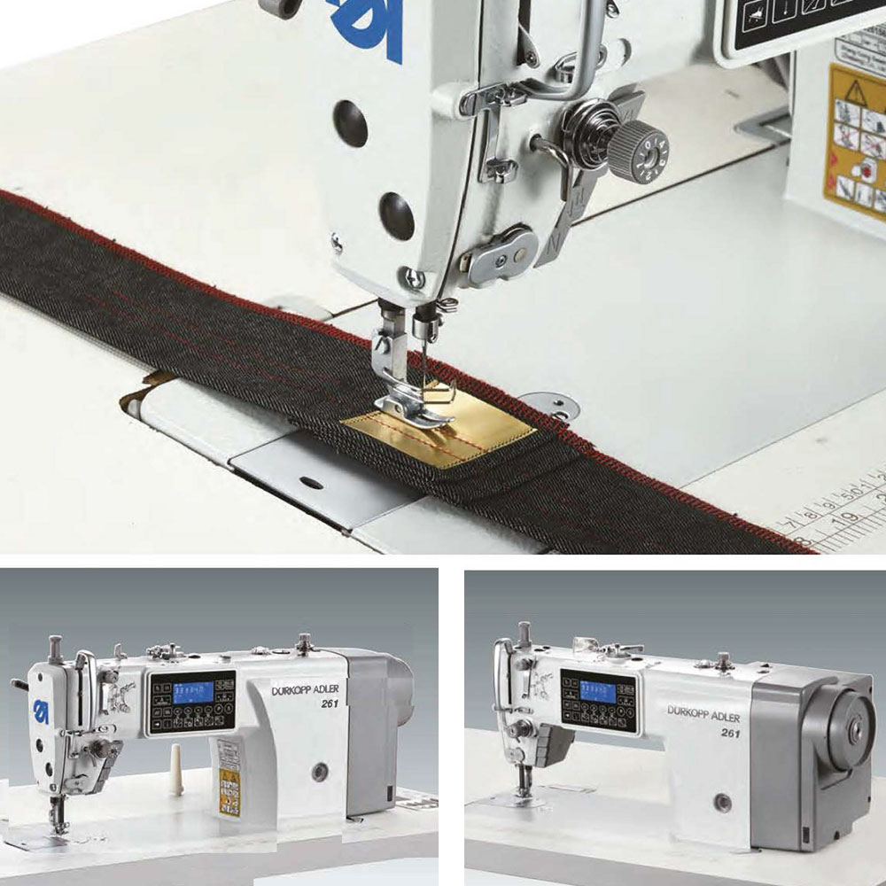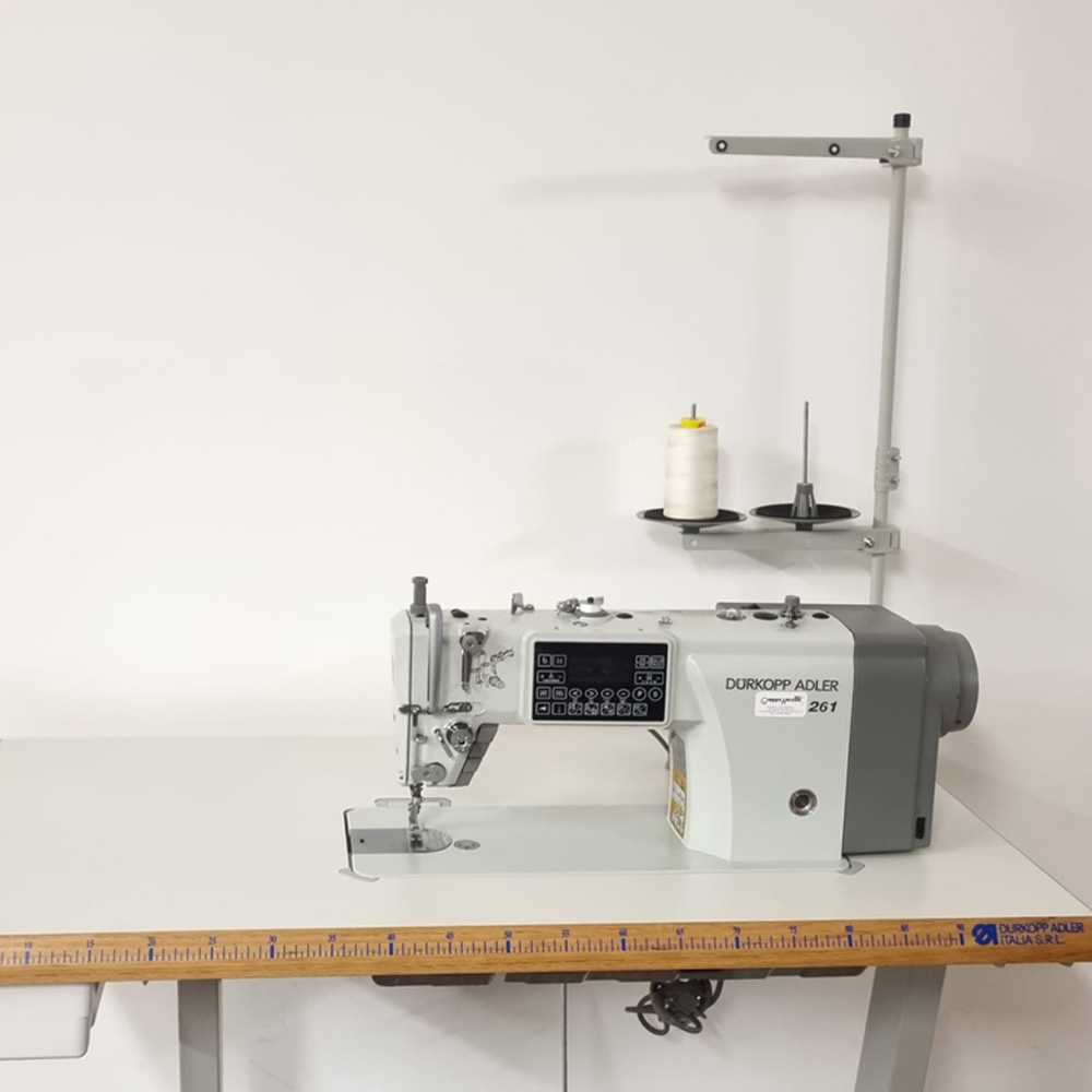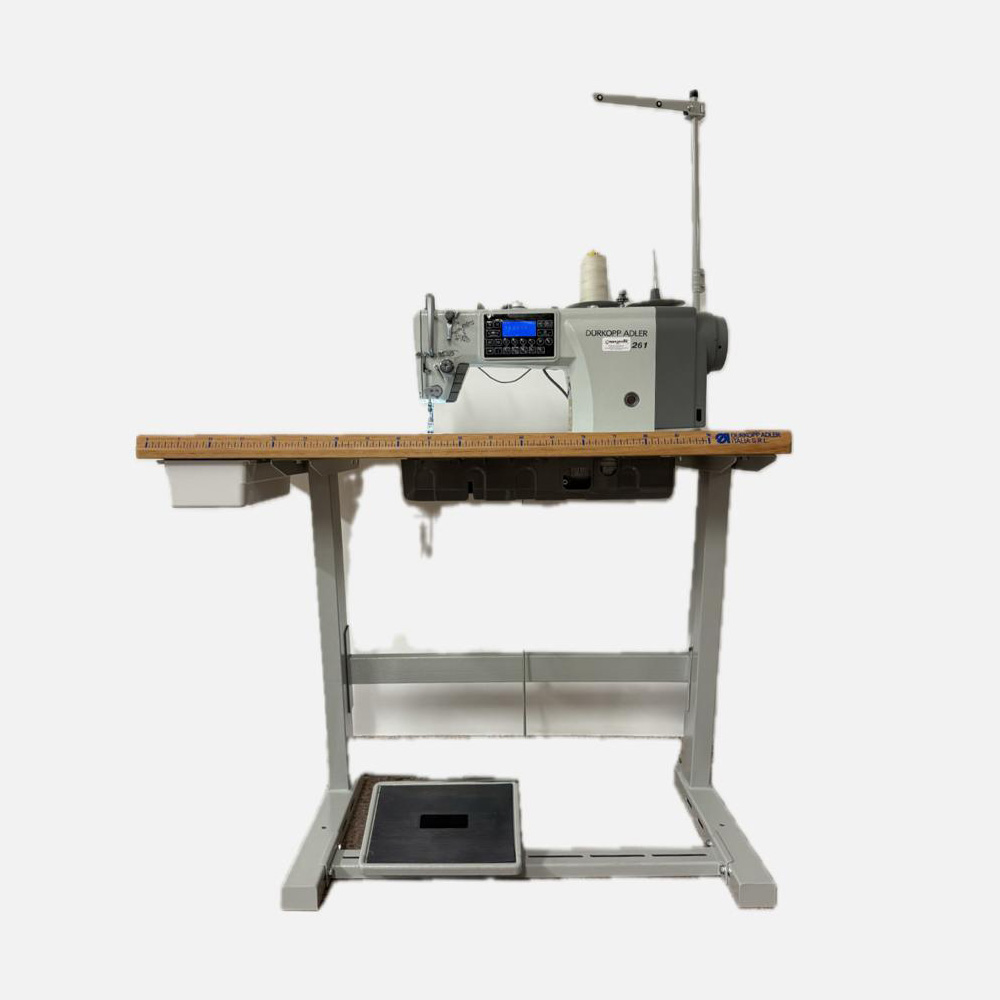 Macchina da cucire Durkopp Adler 261-140542-01 ad alta velocità utilizzata per cucire vari capi di abbigliamento, tra i quali camicie, abiti e pantaloni. Grazie alle funzioni automatiche di rasafilo, alzapiedino e retromarcia, è adatta a diversi processi di cucitura.