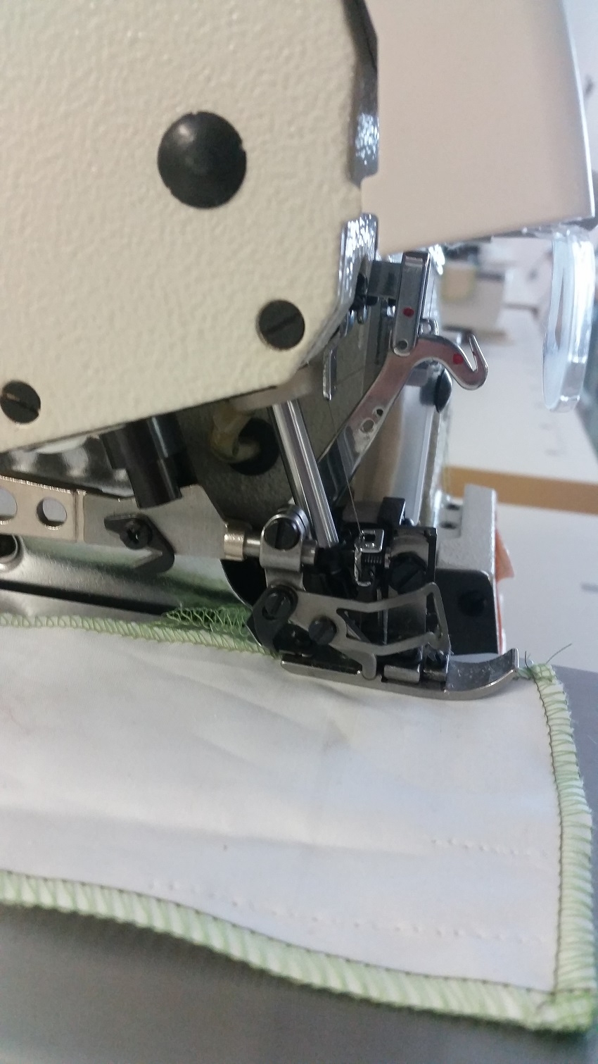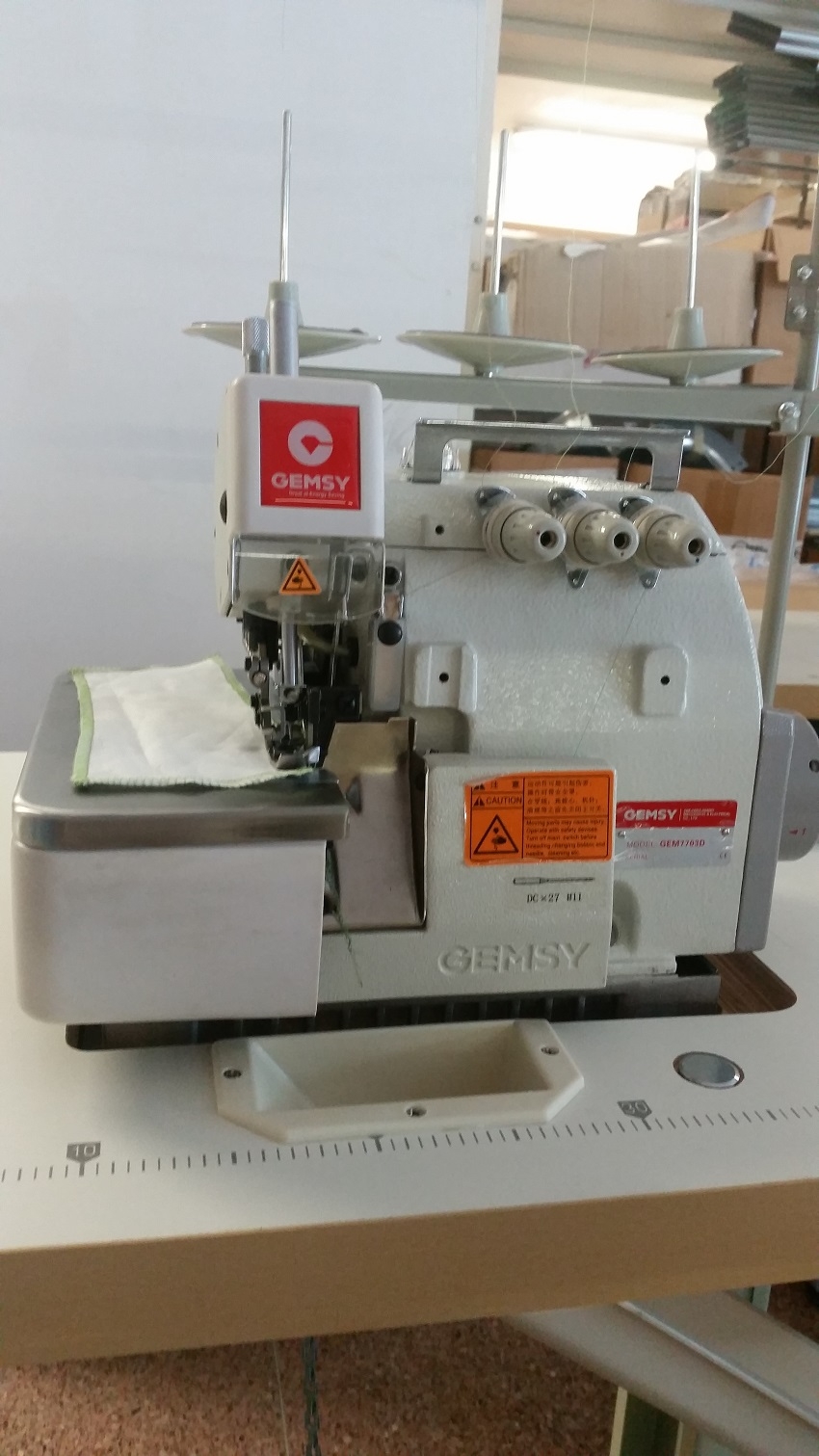 Macchina tagliacuci Gemsy, un ago, tre fili, direct drive, completa di tavolo, sostegno e motore.