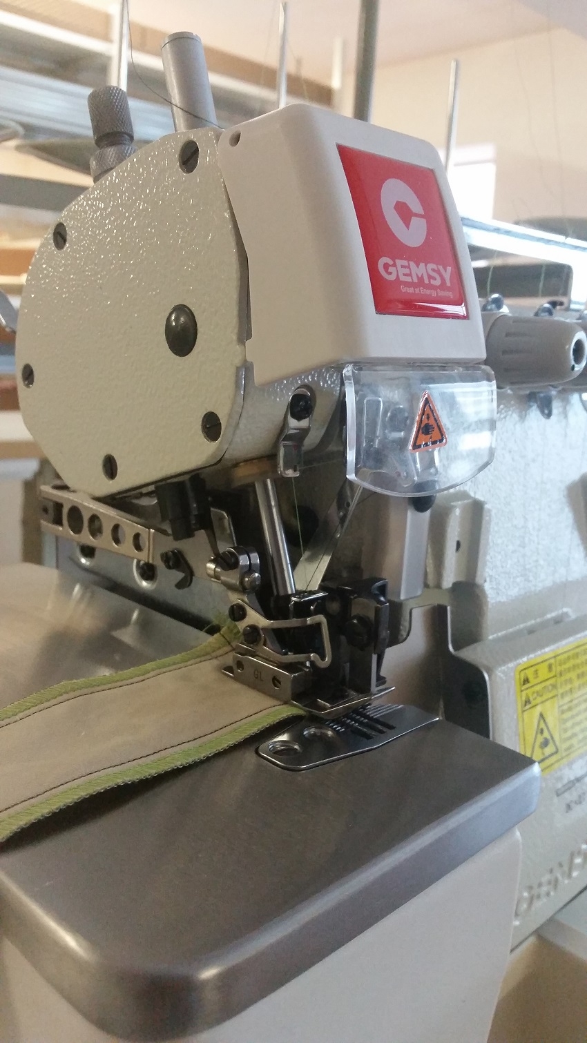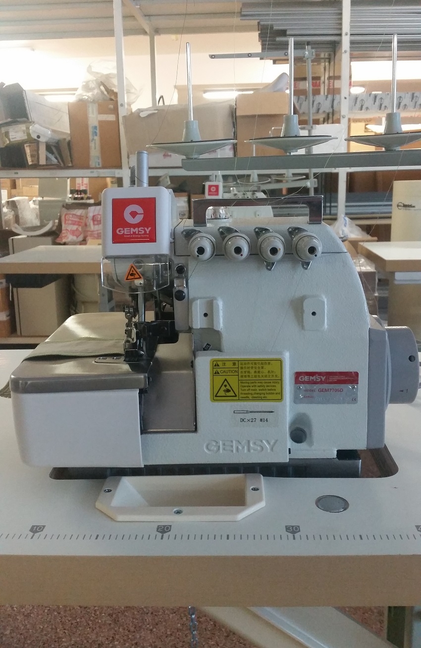 Macchina tagliacuci Gemsy, due aghi, cinque fili, direct drive, completa di tavolo, sostegno e motore.